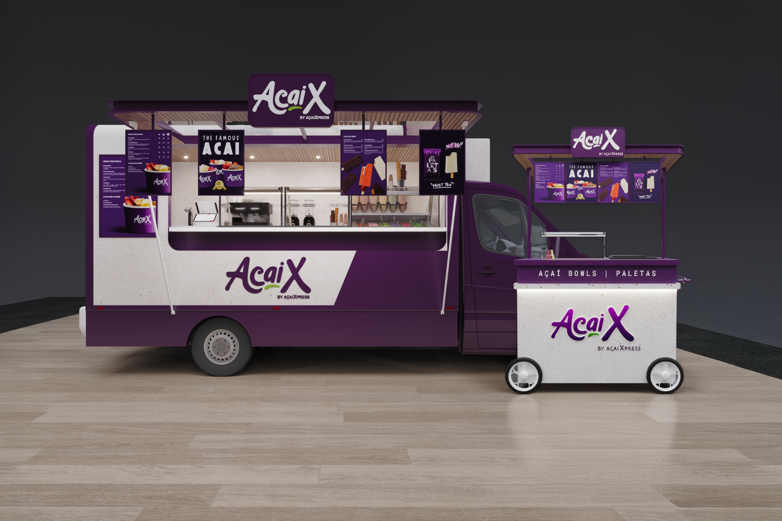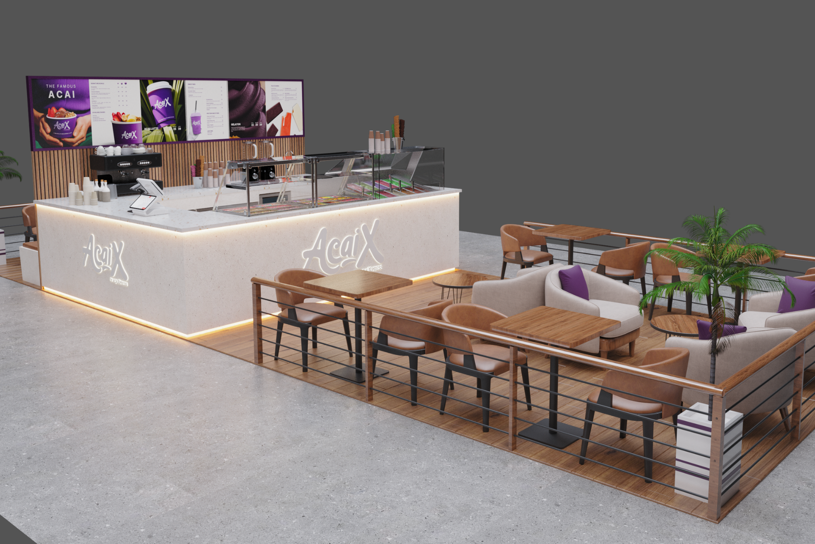 A bold outdoor kiosk designed for open spaces, blending striking AcaiX purple, sharp lines, and practical shading to create a vibrant, recognizable landmark. With smooth service flow, clear visual displays, and an inviting atmosphere, it delivers a quick and premium acai experience for beachgoers, park visitors, and travelers, proudly carrying the mark of the UAE’s acai pioneers since 2014.